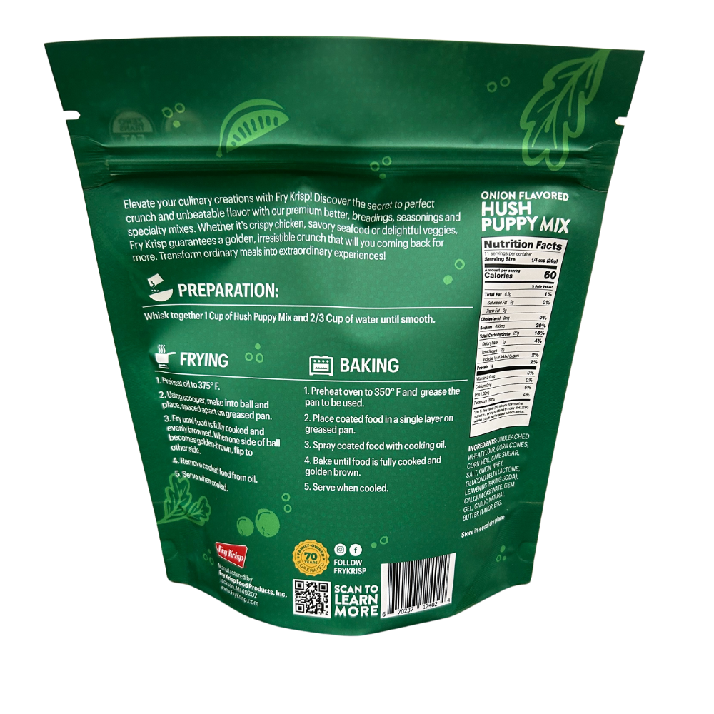 Bring the authentic taste of Southern comfort food to your kitchen with Fry Krisp's Onion Flavored Hush Puppy Mix. This 12oz (340g) mix makes it easy to create perfectly seasoned, golden-brown hush puppies that are crispy on the outside and tender on the inside. Whether you're serving them alongside seafood or as a standalone appetizer, these savory bites will transport you straight to a Southern kitchen.